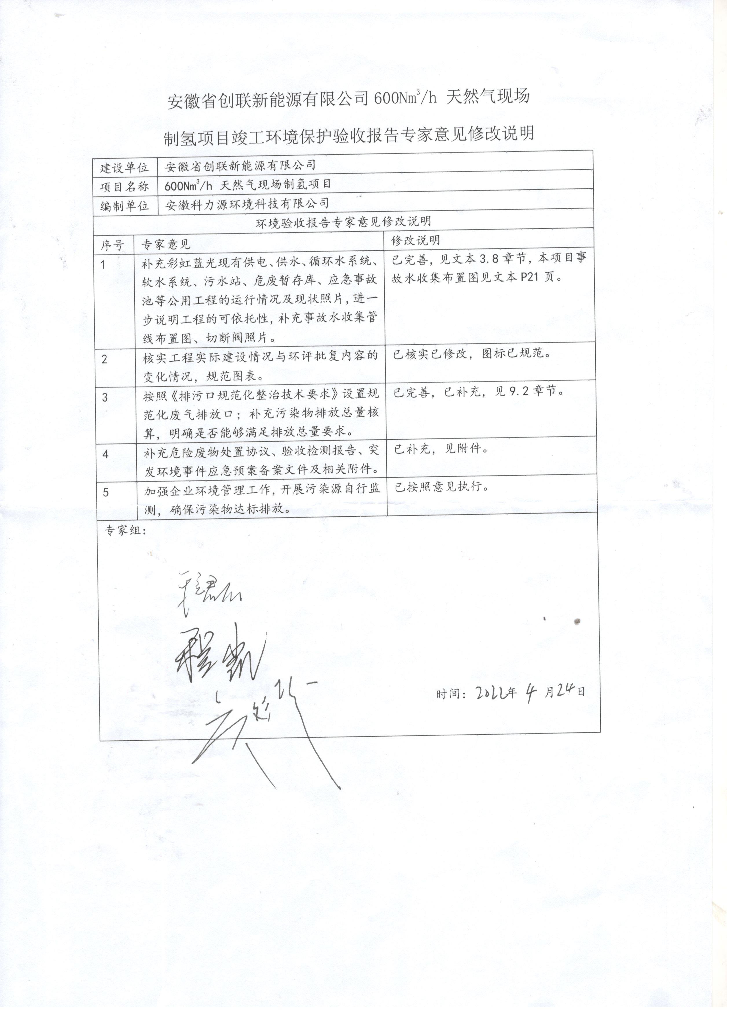安徽省創(chuàng)聯(lián)新能源有限公司600Nm3/h 天然氣現(xiàn)場制氫項(xiàng)目驗(yàn)收組嚴(yán)格依照國家有關(guān)法律法規(guī)、建設(shè)項(xiàng)目竣工環(huán)境保護(hù)驗(yàn)收技術(shù)規(guī)范、本項(xiàng)目環(huán)評報告書和審批部門審批決定等要求對本項(xiàng)目進(jìn)行驗(yàn)收。驗(yàn)收組認(rèn)為本項(xiàng)目實(shí)施工程按照環(huán)評及其批復(fù)的要求,落實(shí)了相關(guān)環(huán)保設(shè)施,建立了相應(yīng)環(huán)保管理制度,符合環(huán)保驗(yàn)收條件,可通過環(huán)保驗(yàn)收。根據(jù)《國務(wù)院關(guān)于修改<建設(shè)項(xiàng)目環(huán)境保護(hù)管理?xiàng)l例>的決定》(國務(wù)院令第682號),以及環(huán)境保護(hù)部《關(guān)于發(fā)布<建設(shè)項(xiàng)目竣工環(huán)境保護(hù)驗(yàn)收暫行辦法>的公告(國環(huán)規(guī)環(huán)評[2017]4號),現(xiàn)安徽省創(chuàng)聯(lián)新能源有限公司600Nm3/h 天然氣現(xiàn)場制氫項(xiàng)目竣工環(huán)境保護(hù)驗(yàn)收報告公示如下: